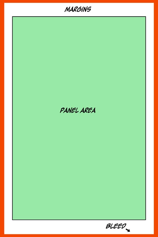 Let's set up the Photoshop document. I usually start with a 10.5 X 7" document (in RGB, I'll talk about dealing with color later...), filled with white. Now, mentally divide the page, allowing about 1/8 of an inch border all around for bleed (the area that will be trimmed in order to have artwork go all the way to the edge of the page). The panels with the artwork will lie in the center of the page, surrounded by a variable margin of whitespace that aids in readability, and allows for the center binding of a comic.