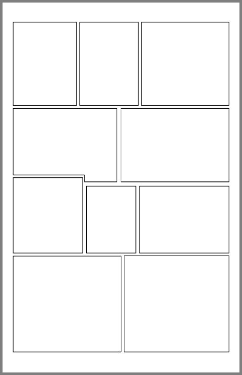 Continue to tweak the shapes of the panels by selecting the panel area with the Marquee Tool, and "Transforming" the selected area to the right size and shape. Use layer masks to make more complex shapes (like panel 9 on this page). If you need more flexibility, you can make each panel a separate layer (with its own layer effect, and clipped Smart Object layer on top. That way you could have different effects on each panel, if that's called for.