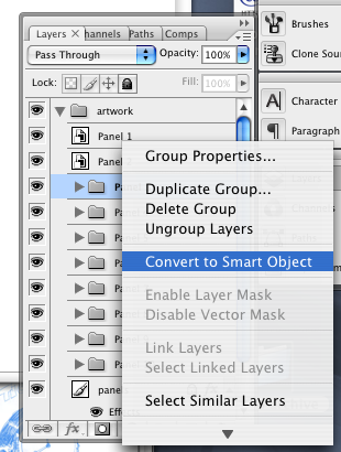 Suddenly, those Smart Objects are clipped by the shape of the panel layer. Now you can select the individual objects, oh heck, let's call them panels, and resize them to better fit, further masking the them (add a mask layer to the Smart Object) if there's any overlap into adjacent panels.